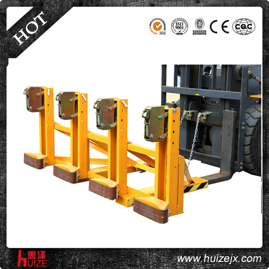 重型四油桶夾單鷹嘴DG2000A純機械機構(gòu)設(shè)計可與叉車方便地配合,僅依靠叉車的動作,不需要其它的動力,可自動一次搬運4個鋼制油桶,  配置可拆換式柔性耐磨保護(hù)墊,有效保護(hù)油桶并緩沖叉車行駛過程中的震動, 能在集裝箱等這樣狹小的環(huán)境內(nèi)裝卸桶裝物質(zhì),可極大地提高空間利用率, 與貨叉連接配有自鎖裝置確保油桶夾在坡度上和顛簸路面使用時不會滑落.